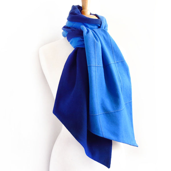 The Lexington scarves are 100% cotton flannel, for a soft, cozy scarf that is incredibly warm, and can be worn any way you like. The ellington scarf features a large scale windowpane check drawn by hand, and then stitched in blue and gray heavy duty thread on bright blue flannel, and paired with navy blue flannel lining.